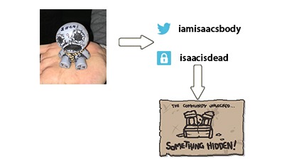 确定了地点后,来自Reddit的玩家开始对这栋建筑进行探索。他们很快就发现了地面有一块明显翻动过的痕迹,挖开这块土地后发现了一个雕像,雕像上面写满了字母、数字以及符号。玩家将雕像头顶上的“@”利用ASC II码转换得到了“@”,然后结合雕像身上的其他英文字母作为密码,成功登陆了@iamisaacsbody 的推特账号,并且根据提示发布了一条推文,随后迅速得到了开发者对于解锁成功的回应。由捐款机引发的一系列解谜终于告一段落,作者随后便对游戏进行了更新,新角色Keeper正式上线,这场玩家乐在其中,开发者也喜闻乐见的ARG就此完美结束。