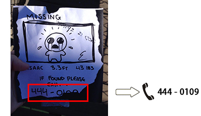 在这个109×109像素的图片中隐藏了重要信息,图标的正下方有两行像素风格字体“and he removed that day that he goats”,该句出自《圣经》——创世记30:35。就在破解谜题的紧要关头,Edmund Mcmillen在推特发布了一张似乎无关紧要的照片,而细心的玩家却发现墙上贴的海报是部老电影《The Lost Boys》。