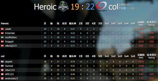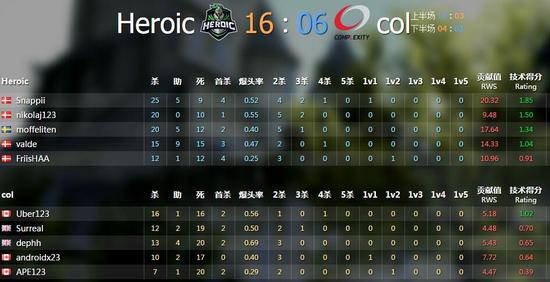 上半场比赛snappi成为最闪光的选手,他接连完成三杀、四杀,只要他获得击杀的那一局基本上都能赢下,上半场比赛的节奏也完全被丹麦人掌控着,半场结束时Heroic领先对手12-3。下半场col赢下手枪局并追回3分,但此后丹麦人没有给他们任何机会,连取4分后拿下第一场比赛的胜利。