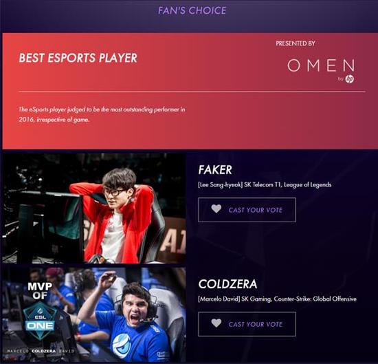 在2016年度游戏奖项的候选名单中,Faker被提名为了年度最佳电竞选手候选人。