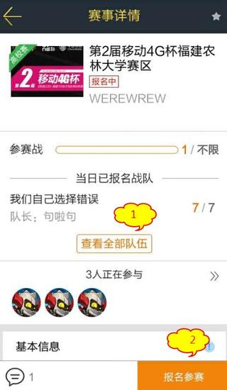 点击2“报名参赛”选择带上你的战队报名参赛,如果你不是战队队长,点击通知队长报名与队长私聊,或是组建临时战队组建专属于你们的战队(组建战队须填写战队资料),从此开始赛事征程。