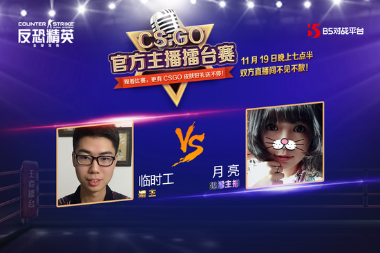 11月19日,CS:GO官方主播擂台赛第一期将正式擂鼓开赛,主播临时工战士将成为首期擂主并接受来自攻擂主播月亮的挑战,到底是临时工能守住自己擂主的宝座,还是月亮巾帼不让须眉成功攻擂,让我们拭目以待!