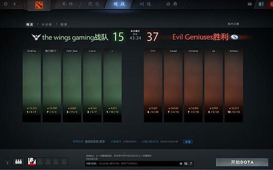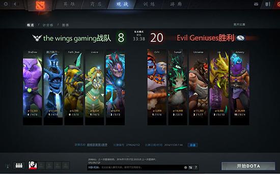 23分钟开团。虚空完美关到四人,技能叫出打残了Wings。敌法卡尔及时出现,人群中杀进杀出无人能挡,EG雪崩。宝石入手之后追杀三条街干掉蚂蚁。EG正面再无反抗之力,上路被推,Wings再攻中路。见大势已去,EG打出GG。Wings仅耗时25分钟先下一城。比分22:9。