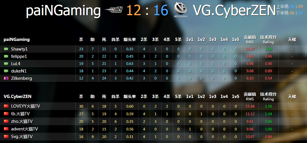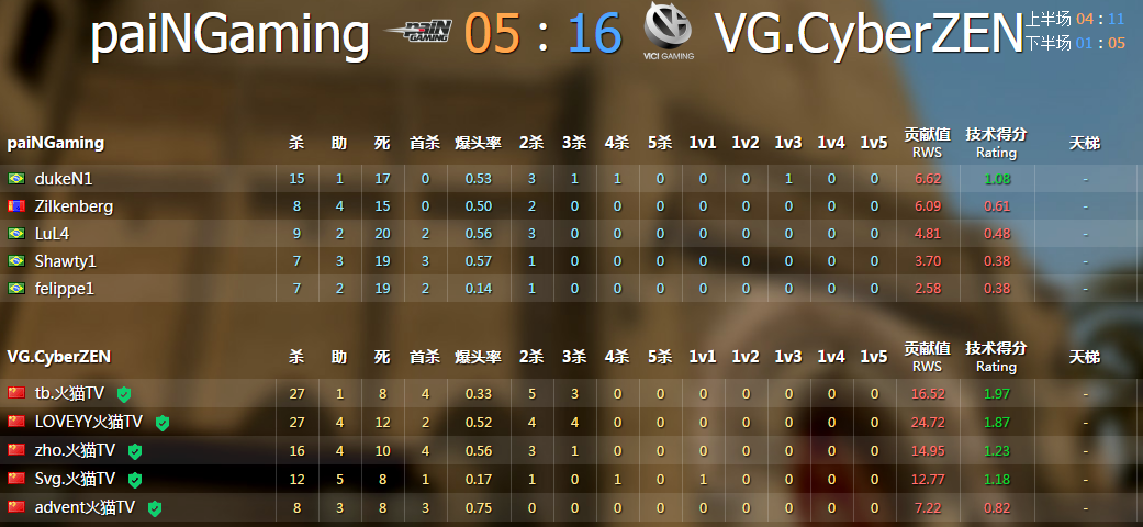 双方率先在train上展开争夺,VG先做T进攻取得4-0开局,随后paiN连守三分将比分迫近,VG展开凌厉的攻势连得5分,进一步扩大自己的领先优势。上半场最后两局paiN成功拿下之后半场6-9落后,双方换边之后继续展开争夺。VG下半场再次赢下手枪局,随后来到11-6领先。