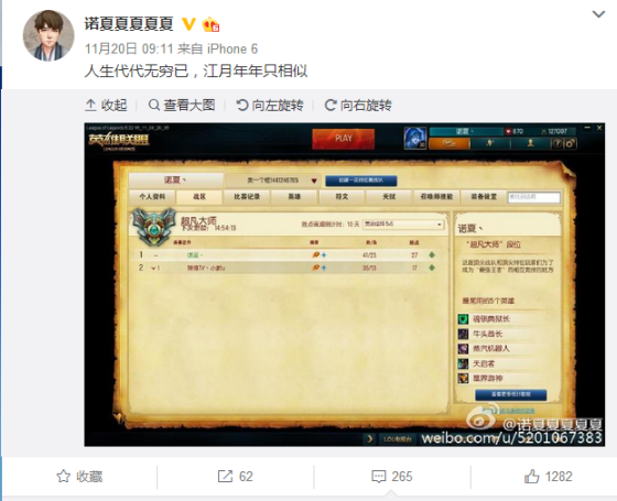 前几日,诺夏在微博上分享出他的最新战绩,在S7季前赛再上大师,看起来状态保持的额相当不错。