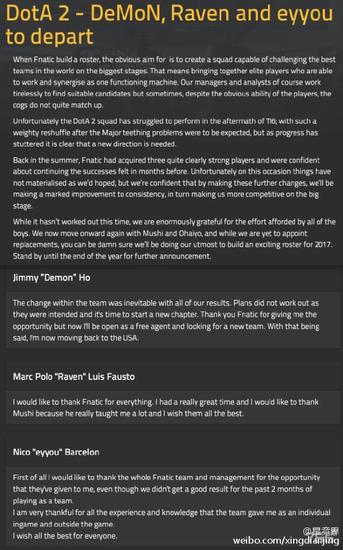 今日凌晨Fnatic官方发表声明,表示现在队伍竞争力不足,需要进行人员调整,宣布demons raven eyyou三人离开队伍!并表示将在2017年重组一个“激动人心”的队伍。心疼我“远古巨鱼”DEMON,在V社纪录片里的一句玩笑话“我又要被踢了吗?”,竟然变成了现实!