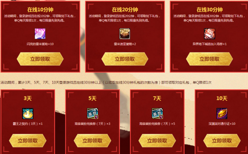 活动期间,累计3天、5天、7天、10天登录游戏且在线30分钟以上(以领取在线30分钟礼包的次数为准)即可领取对应礼包,单Q限领1次