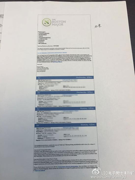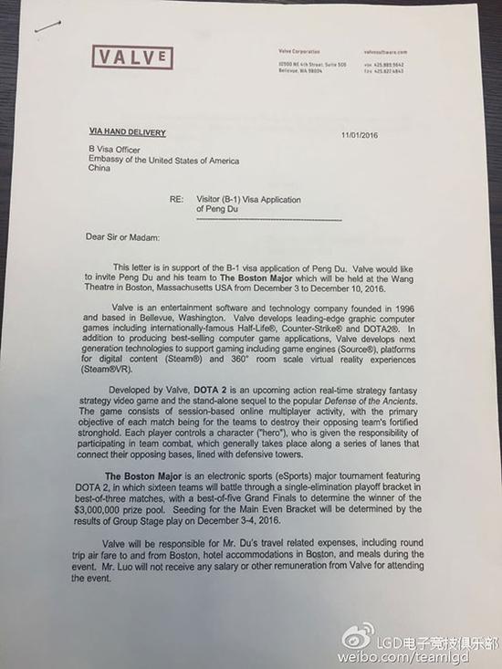 为了稳妥起见,根据以往战队参加V社主办赛事的经验,俱乐部等到签证的重要材料——V社的邀请函原件后,就立即为LGD.FY战队成员Monet杜鹏、LPC罗蒲超和LGD战队成员Jixing肖子豪(为以后出国比赛提前准备)等三人递交了申请并预约面签。