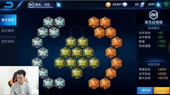 成成是一名主玩嬴政的王者主播,因为嬴政这个英雄伤害比较高,所以他的铭文是红色——凶兆,绿色——心眼,蓝色——狩猎。这三个铭文都是有加攻速的,因为嬴政这个英雄是十分吃攻速的,他可以靠着普攻1和3进行输出,所以普攻伤害非常高,攻速能够让嬴政占据主要地位。