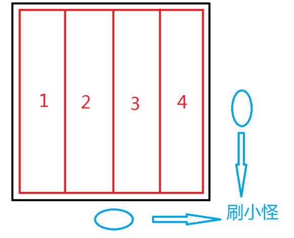Boss场地如图,战斗区域是1-4红色范围内,出红色范围就会拉脱。Boss需要双T可以双明教或者一明教主T一和尚副T。开怪后主T将boss拉到场地靠近下方刷怪点的位置,远程在靠近上方位置输出。