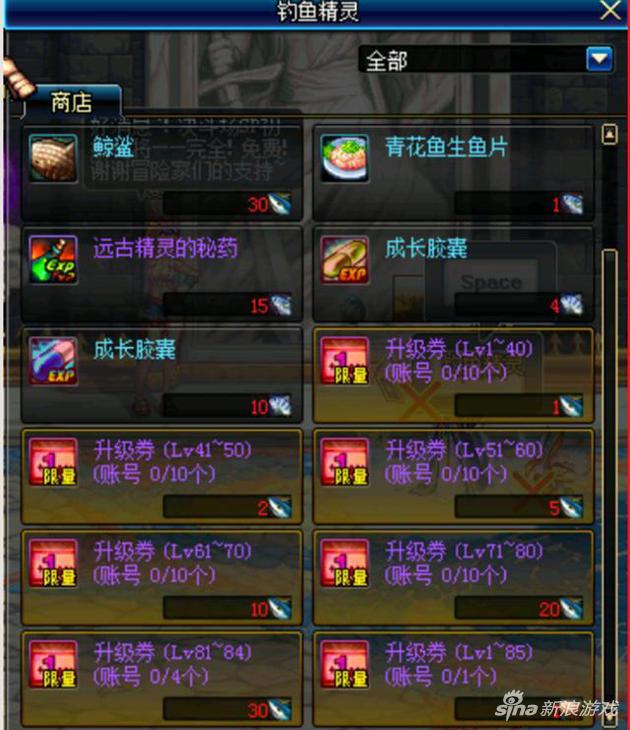 这次相比于上次是为爆肝练小号的勇士准备的,靠钓鱼兑换的升级卷可以直接让一个角色满级。此次还加入了85级升级卷(说明90级不远了),打算练新角色的玩家可以去钓鱼一波。虽然比较耗费金币材料,不过省去了时间,也是不错的。