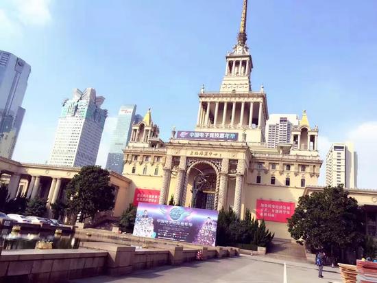 首先映入我们眼帘的是极具俄罗斯古典主义建筑风格的上海展览中心,而在前面,CEC中国电子竞技嘉年华的主题宣传海报赫然映入眼帘,老远就能看到人皇SKY和皇室战争全球第一人钟培生,想想明天就能见到真人了还是很激动的。