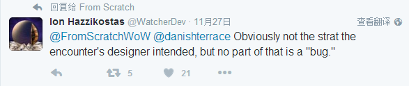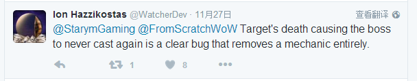 11月27日,魔兽设计师Ion Hazzikostas在推特上对这次M海拉首杀利用bug的事件进行了一些回复。