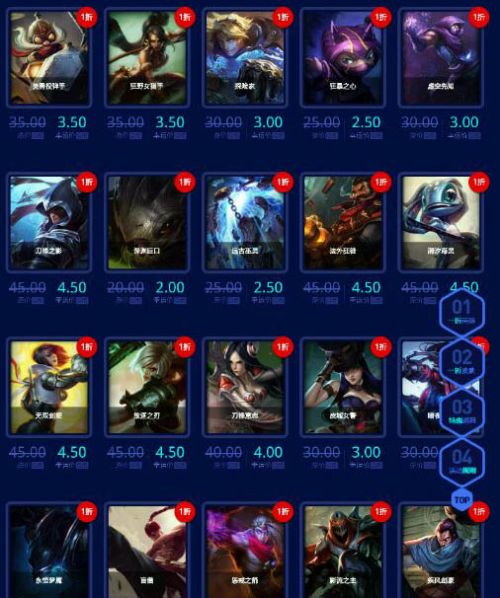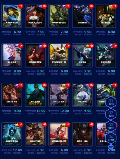 1。一折英雄(各种6300英雄,各种热门英雄以及比赛非BAN必选英雄)注:所有一折英雄只能选购一个
