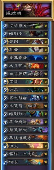 爆牌贼是近期真正兴起的一套卡组,以前都是作为娱乐套牌,直到大家发现爆牌贼打萨满,防战等控制职业均有优势时,才发现爆牌贼是现版本一个奇兵卡组,这是会长使用的卡组。