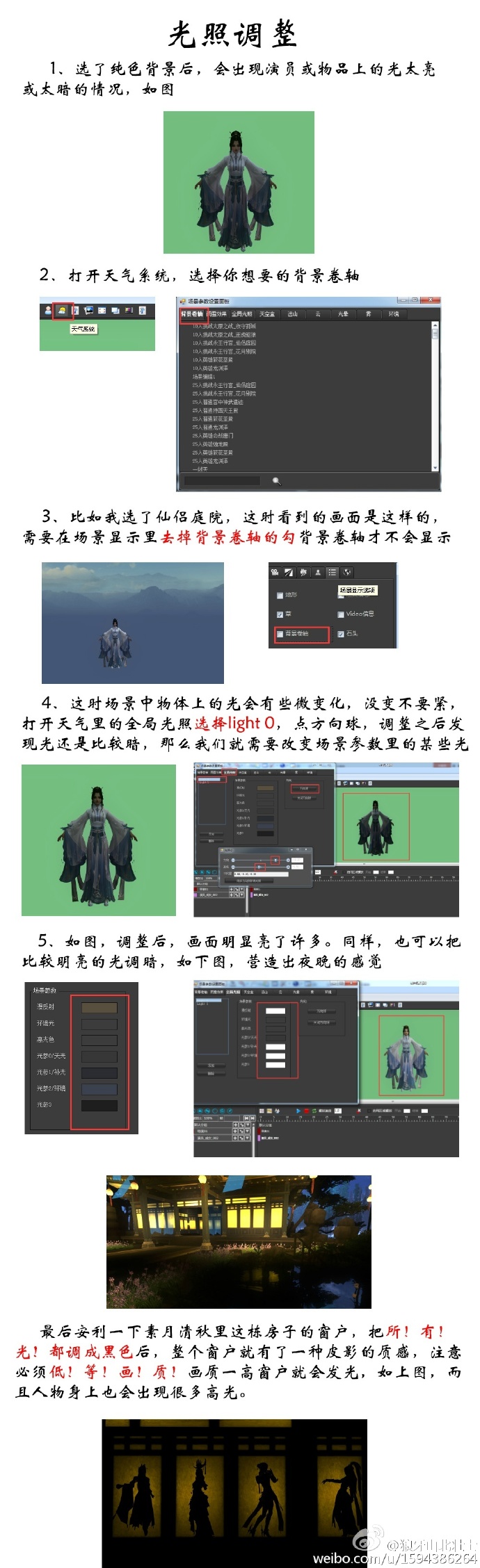 本期主要为大家介绍纯色背景的制作与光照明暗的调整,最后为大家展示的是深夜庭院和皮影的捏图小技巧。