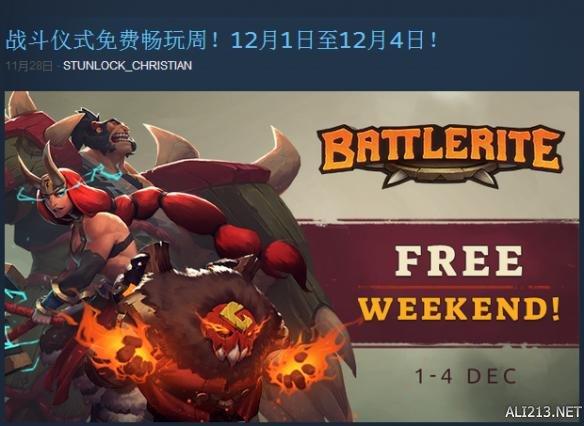 《战斗仪式(Battlerite)》是一款在Steam上目前颇受玩家好评的MOBA(多人在线竞技游戏)游戏,近日游戏官方在游戏的Steam页面上公布了游戏即将在明天开始的为期四天(12月1号至4号)的免费试玩活动。同时在免费试玩期间,游戏也将以7.5折促销。
