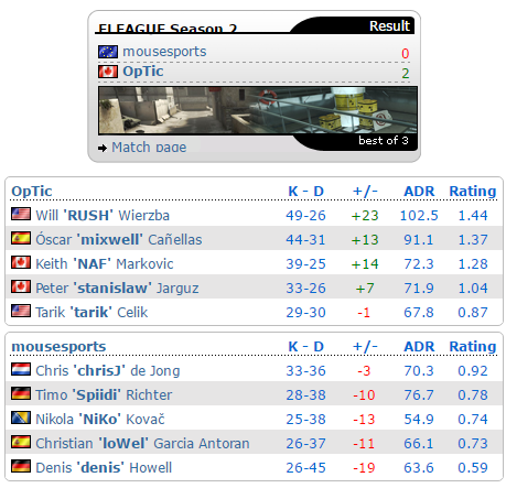 下半场的剧情和上半场类似,在一波追分之后,mouz和OpTic仅仅只有两分的差距。但是,在stanislaw惊人的1v3残局之后,OpTic将mouz打入了棺材,以16-11拿下了比赛的胜利。