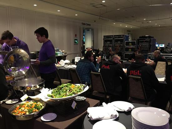 最外面的是员工餐区,酒店除了当天有比赛的队伍不提供午餐和晚餐,所以一般就在这里解决的,国内战队的话貌似喊外卖的比较多,附近有不少中餐馆,外卖可以减少很多路上的时间。