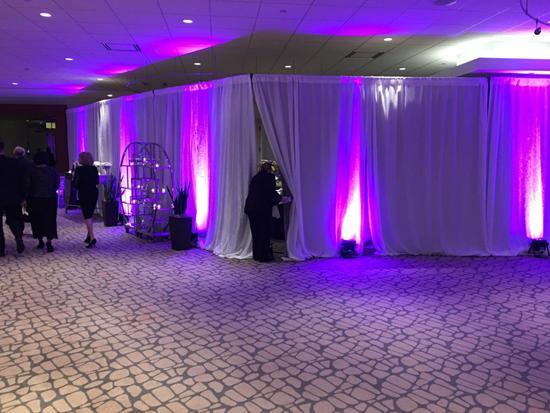 我们的导播区域在媒体日拍照大厅的旁边,而今天开始大厅每天都有酒店自己举办的华丽宴会,为了防止被打扰,工作人员用门帘隔了开来。