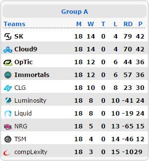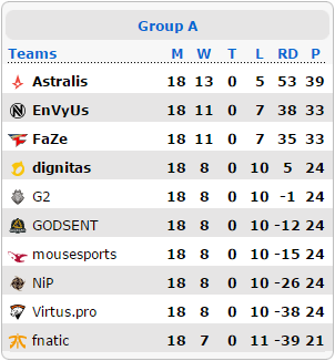 欧洲区的比分相当离奇,前三名之外有六支队伍都是8胜10负的相同战绩。而dignitas凭借小分的优势排名第四,幸运的取得了ECS第二赛季线下赛的参赛资格。