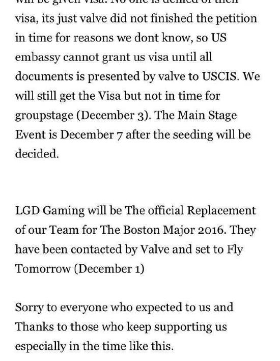 Xctn表示:签证不是没过而是在等v社发需要的文件过来。一旦申请文件提供过来他们就能拿到签证,可是v社一直没发,现在来不及了,v社决定给lgd名额。