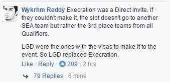 官方解释:因为execration是直邀所以并不是名额顺延给东南亚第三名,lgd有签证所以给lgd。