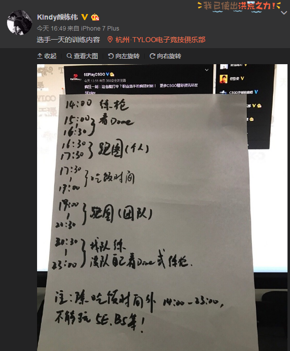 近日,Tyloo俱乐部领队Kindy发布了一张关于Tyloo的训练表,内容如下: