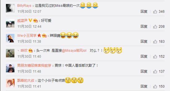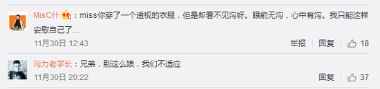 “头回见这么娘的男孩子,长见识了”,“兄弟别这么娘我不适应”,看来大小姐和粉丝们真的是小冤家……不就是稍微平坦了一点点?蓝孩子、小胸弟、一口一个哥们儿,还有粉丝表示自从Miss开始发小视频,身体就越来越差,这下又要补营养了。诸位Miss粉丝们,据小编诊断你们应该是被掰弯了~~