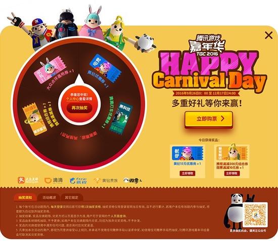 四大特色奖区对应四类不同的抽奖礼包,2016TGC预计投放价值过亿的礼包送给参与抽奖的玩家,而礼包数量更是将超过6000万份,创造历史新高。其中福利券内容就包含1000万份大众点评抵用券,300万份携程200元满减组合券,300万份滴滴打车满减组合券,4000万份黄钻优惠券,500万份微票优惠券等,更有丰富的游戏礼包会在十月份与玩家见面。本次转盘抽奖为了给更多的玩家创造欢乐,特别实行“零”门槛的抽奖规则,玩家只需要登录官网即可获得3次抽奖机会,各类好礼轻松收入囊中。