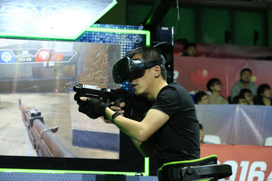 此外,在比赛现场还进行了全民枪战VR的表演赛。新奇的玩法、立体的对战体验,吸引了全场观众的目光。