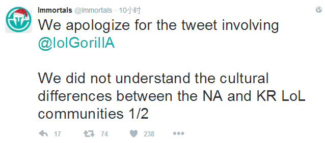 “我们向推文涉及的Gorilla致歉。我们确实不了解美韩之间的文化差异。”