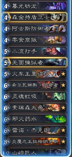 卡组直接放弃了宇宙术的招牌卡,大王,靠螺丝和卡扎库斯两张牌打后期,并且用上了斩杀三件套:火车王+力代+无面,后期能力比较一般(反正在青玉德面前都是渣),但是可以斩杀偷鸡。