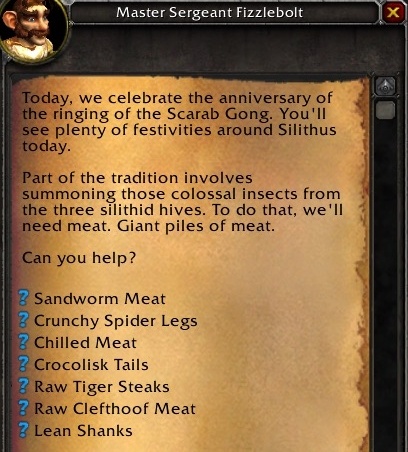 圣甲虫召唤日,又称安其拉炸服纪念日,节日时间为每年1月21日—1月23日,安其拉开门事件作为魔兽第一个全服务器共同参与的大事件,虽然任务线随着大灾变资料片的开放而从游戏中消失了,但这一事件还是非常值得纪念的。