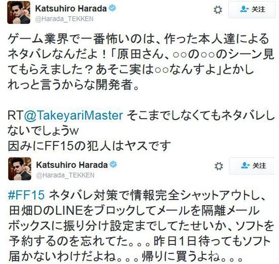 有人表示原田小题大做,但是他回复道,大家不知道,业界最可怕的就是来自开发者的剧透了,他们会说“原田桑,那个什么什么的什么什么场面看了没?其实那是这样这样的”。随随便便就告诉你了。看来小编身边的朋友还算良心,不过近期关于《FF15》的新闻评论中的确不少地雷,虽然游戏已经发售,但是大部分玩家都还没打通,所以各位还请手下留情。