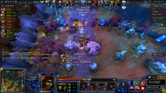 第二局的比赛EG在开局又是占据了主动权,毒狗加拉席克的双游走帮助EG早早打开局面。被游崩三路的Wings加上他们这套几乎零进攻性的阵容,除了闷头刷钱外毫无办法可言。15分钟大鱼人总算憋出跳刀,可跳刀第一波开雾但是却是在EG眼下开的,Wings直接冲进肉山强行打盾,EG闻风赶到形成了围剿之势。偷盾失败,对线崩盘这局Wings巨大劣势的情况下打起来边路带球。EG肯定不会给Wings任何喘息的机会,28分钟带盾上高,用大哥露娜的两命换了Wings下路高地。