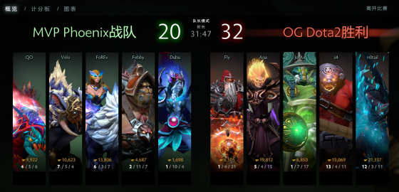 OG在首局拿出来最近比较少见的火猫作为中单,MVP同样一反常规开出了复仇之魂跟亚巴顿的双辅助。前期MVP线上打的非常凶相,局面上一度占优的他们在12分钟被OG一波包夹团战,直接给MVP包了饺子。20分钟MVP下路接团,追击过于激进的OG阵型奇差被MVP抓住机会团灭OG后顺势打盾。随后又是一波GANK月骑成功让MVP有了一种能上高地的感觉。只破了一座高地塔之后MVP送给OG一波团灭大礼。