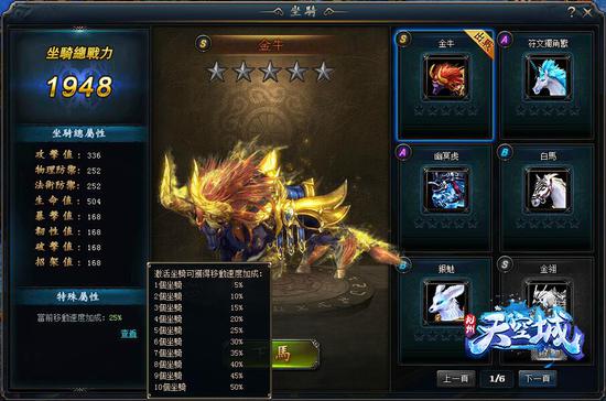 座骑系统是九州天空城内不可缺少的一部份,座骑系统共分B/A/S三个级别,S级别属性最高,B级别最低。也可以透过升星来增加座骑的属性。另外乘座座骑可以提高角色的移动速度,拥有的座骑数量越多,移动速度加成就会越高。赶紧选一匹自己喜欢的仙灵座骑,恣意遨游在美丽的天空城中吧。