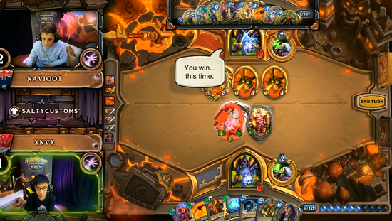 炉石传说中有许多技巧,组卡,细节,读牌能力寻找最优解等等。但除了这些之外,还有心里战。在近期马来西亚的一场比赛中,视频中XNVX已经处于劣势,最后他打出了一堆一套假的COMBO来欺骗对手,火车王+力代(并没有无面),然后对手投降了。