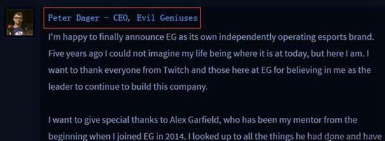 “我很高兴地宣布,EG最终成为了一家独立运营的电竞品牌。五年前,我想都没敢想我以后的生活,但是今天,我在此领导大家。我想要感谢每一位Twitch和EG电子竞技俱乐部的每一位员工,感谢你们相信我能继续带领公司走得更远。”