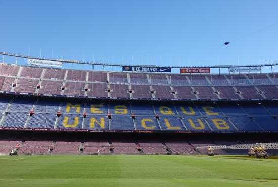 从诺坎普球场二层向下望去,阳光洒满了绿茵场,我仿佛能看到前晚梅西从入口处微笑着跑出来的样子,能听到环绕场地的观众呐喊声仍在回响。