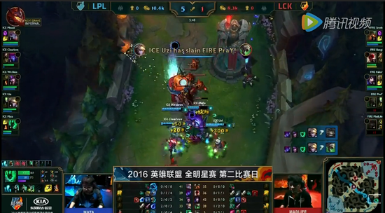 对上LCK那场,下路梦幻开局,前期LPL中野两次下路支援让人头比达到了5:1,形势看来一片大好;RNG双人组合压着对面打,中路韦神和Faker有来有回,上路Mouse猥琐发育。但由于沟通问题(不止是中韩队员的语言障碍,包括中国队员自身沟通也不是很及时),韩国队员在中下两拨小规模团战中将劣势扳回来,Smeb强大的个人能力和LCK让人讶异的团队执行能力让LCK将节奏掌握在了自己手里,反观这两波Mouse的传送和支援就缺乏果断。随后的比赛中,找到节奏的LCK顺利拿下比赛。