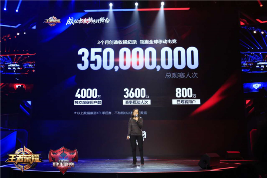 颁奖典礼结束后,腾讯互动娱乐市场部、移动电竞业务部总经理高莉女士在现场进行了KPL赛事内容发布,惊人的观赛数据也是让业内人士震惊不已。在短短的三个月时间内,KPL观赛人次已经突破3.5亿,日观赛用户峰值超过了800万;而在观赛的同时,更有3600多万人参与实时赛事互动。这是电竞史上收视增长最快的记录,这也是全球移动电竞领域引领者的王者姿态!