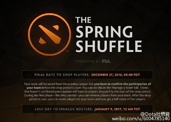 V社已经公布了2017年春季基辅特锦赛前的洗牌期时间,现在所有的DOTA2职业战队都可以操作自己的人员名单,跟以往一样先在离队期将需要移出队伍的选手登记,然后在加入期将5名正选及替补登记完整。