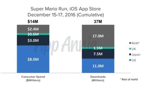 根据App Annie的数据统计,《超级马里奥Run》发布前3天便在全球揽入了大约1400万美元(约合人民币9731万元),有100多万用户为其付费。3天的总下载量约为3700万,全球转化率约为4%。