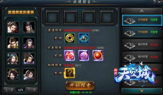 每通关一个州,都可以进行探索,每次探索可派遣4名豪侠,可同时探索多个关卡,但是已派遣的豪侠不可重复派遣。探索分普通、完美和极限三个档次,只要派遣的豪侠达到相应条件,一定时间后便可领取对应的奖励,所以记得要尽可能向极限探索靠近哦!