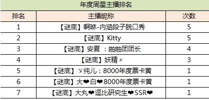 继上周谜底主播包揽全部周星,本周周星依然是谜底的专属,只是主播上有了小小的变化。啊咻本周拿下三个周星,而kitty一口气拿下了四个周星,两人分列1,2位,而本周周星依然控制在谜底手里,当然本周最终的答案依然要看18号晚24点时候的情况,下周将继续给你带来周星最新情况。