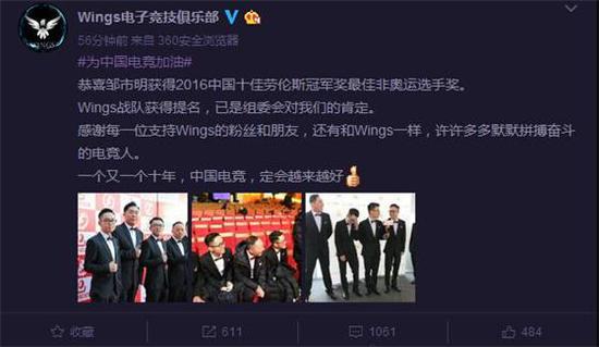 虽然Wings战队没有夺得该奖项,但是为中国电竞做出的贡献可以说是非常之深远,虽然电竞现在还不能完全被接受,但是我相信在不久的将来中国电竞会越来越好,终有一日会获得所有人的认可!中国电竞请继续加油!