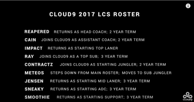 北京时间12月20日,《英雄联盟(LOL)》北美LCS赛区C9战队最终确定了2017年的阵容名单。可以看到,打野Meteos被从首发阵容中移除了出去,而Contractz则晋升到了首发阵容。除此之外,C9也宣布了一位新的教练助理Cain的加盟,而Ray则是替补上单。