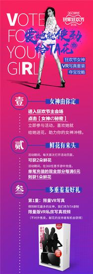 除了送花选女神、圣诞节约会女神外,360游戏玩家狂欢节还为玩家特意准备了“特殊”福利,将为得到鲜花最多的女神录制VR私房写真,这些视频不会对外售卖,而是提供给送花的玩家们。此外,还将在献花的玩家中随机抽取10名幸运玩家,开展30分钟1对1直播互动。每个女神还会在自己的支持者当中抽取50名玩家,赠送VR眼镜一台,鲜花次数越多,中奖几率越高。